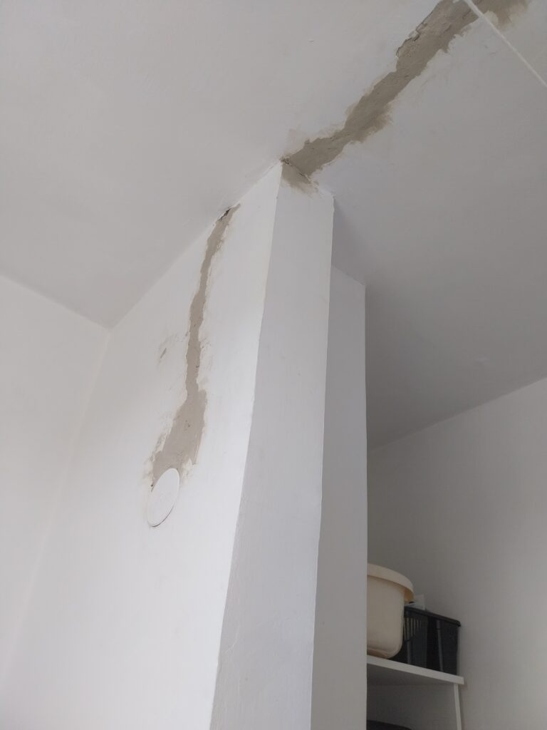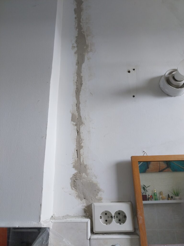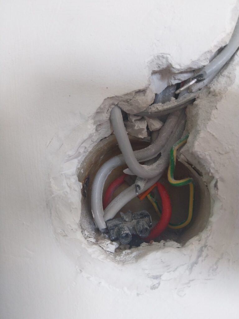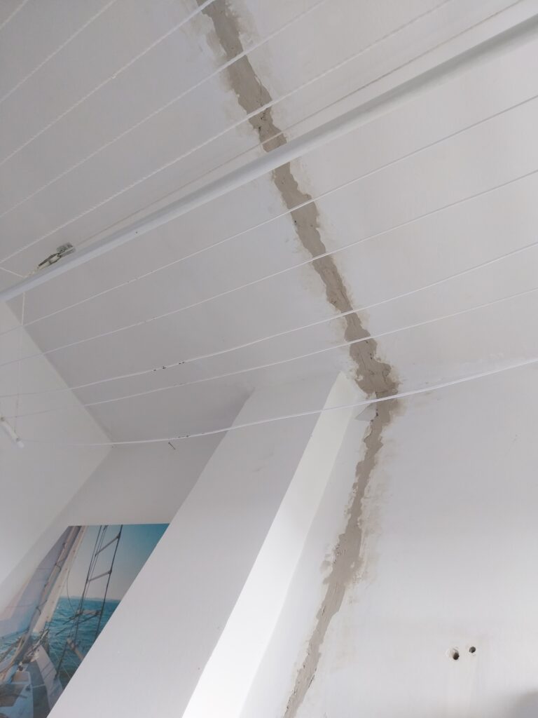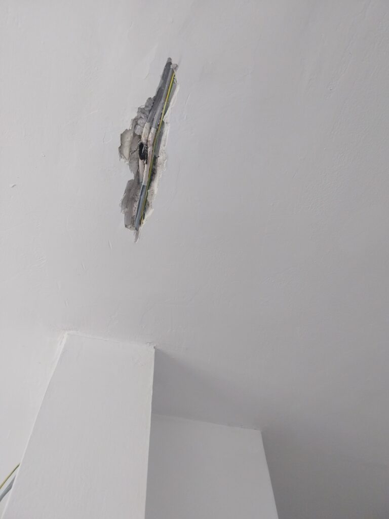 Elsőként a toldással próbálkoztam, de újra jelentkezett a zárlat. Ekkor már biztos voltam benne, hogy a hiba a vezetékben van. Az előző festés nyomán halványan látszott a vezeték nyomvonala, és észrevettem egy gyanús pontot a mennyezeten.
