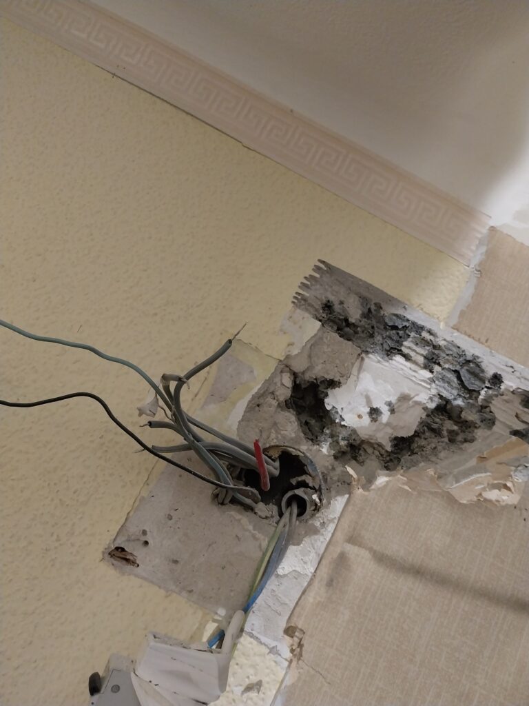 🚫 Egy burkolat nélküli, feszültség alatt álló dugaszoló aljzatot találtam, amelyet egyszerűen tapétával fedtek le – ez rendkívül veszélyes, és azonnali intézkedést igényelt.