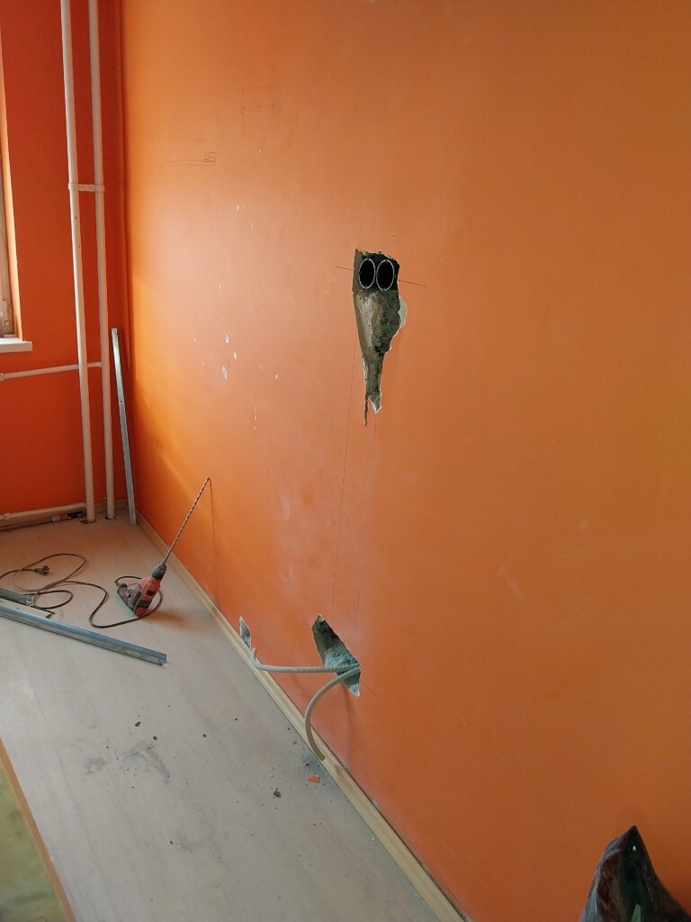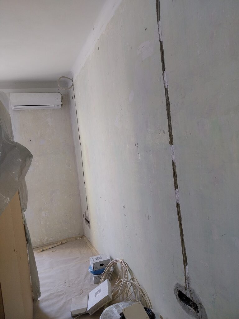 🔧 Első lépésként megkezdődött a függőleges hornyok marása, amelyek az új áramkörök fali nyomvonalait biztosítják. Ezeket kizárólag ott alakítottuk ki, ahol statikailag biztonságos volt, és ahol a kábelcsatornás vezetés nem volt esztétikailag megfelelő.
