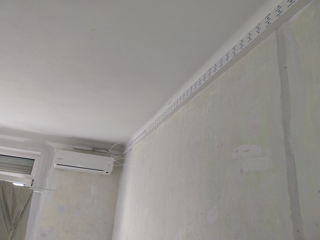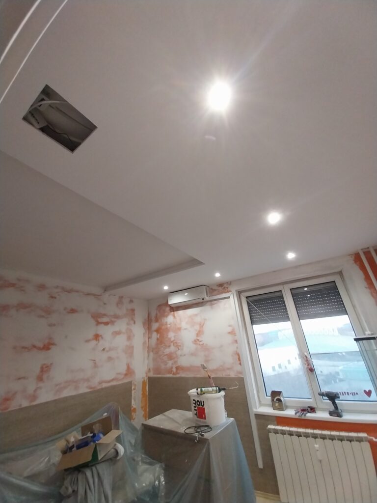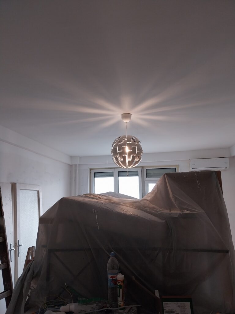 🔧 A hálószobában elhelyezett vezetékeket részben az álmennyezet felett, gégecsőben vezettem a fürdőszoba irányába, illetve a helyiség leágazásaihoz. Ez a megoldás nemcsak takarékos a falmarásokkal, de kíméli is a szerkezetet és esztétikailag rejtett kivitelezést tesz lehetővé.