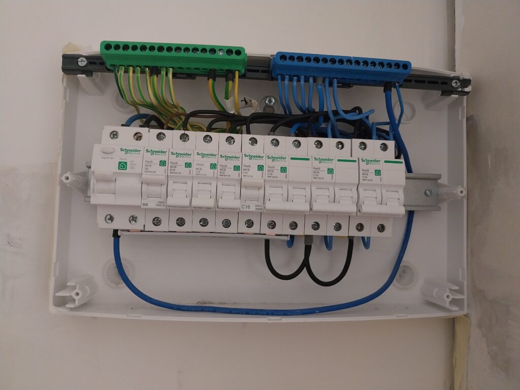 A kivitelezés egyik legfontosabb eleme az új fogyasztói elosztó berendezés kialakítása volt, hiszen ez biztosítja a lakás villamos hálózatának biztonságos, átlátható és korszerű működését.