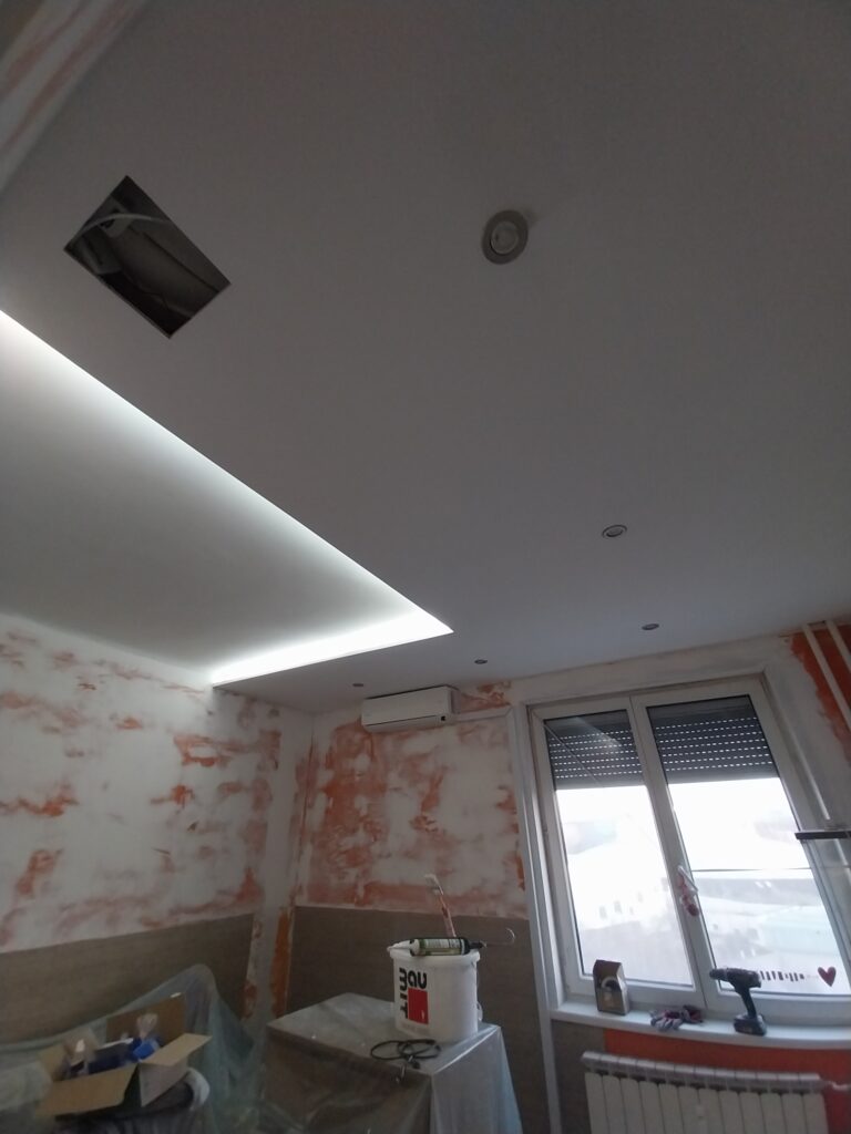 A hálószobában egy esztétikus, gipszkarton álmennyezet került kialakításra, amely nemcsak a látványt fokozza, de lehetőséget adott a rejtett LED világítás és SPOT fényforrások telepítésére is. A világítás így modern, letisztult hatást kelt, miközben kellemes, meleg fényt biztosít a helyiségben.