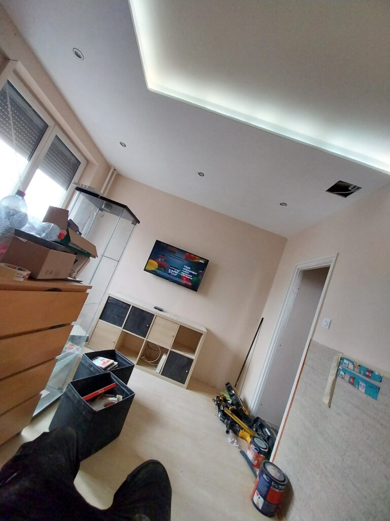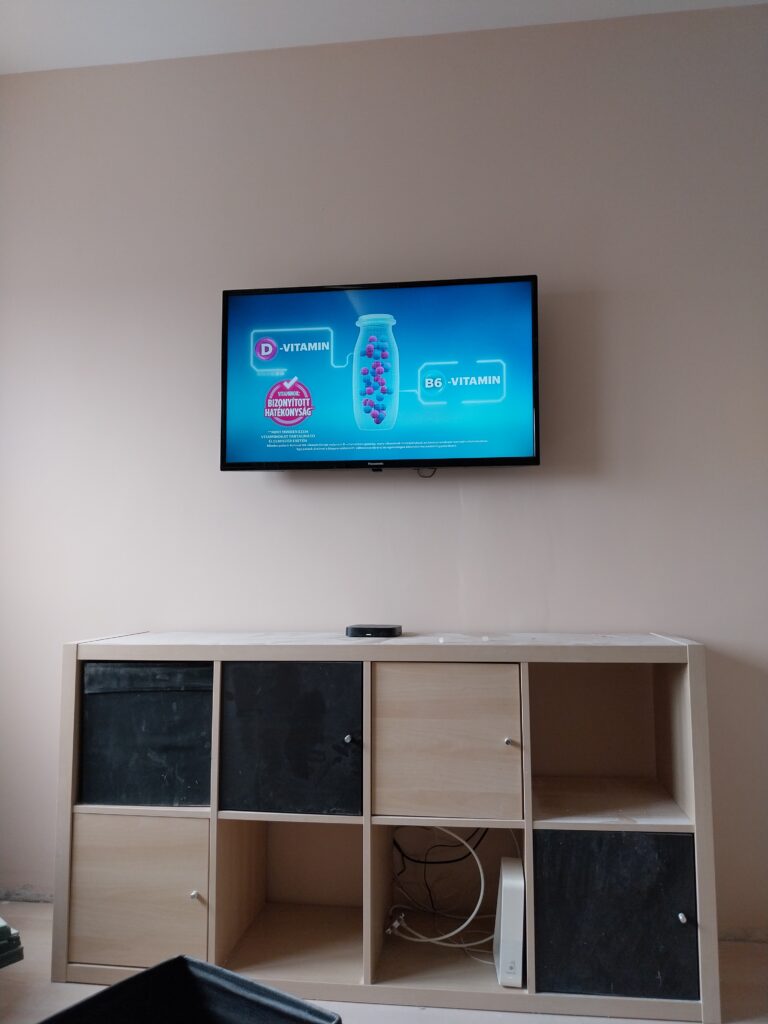 📺 A szoba egyik fő eleme a falra szerelt TV, amelyhez a villamos kivitelezésnél külön figyelmet fordítottam arra, hogy minden szükséges aljzat (230V és gyengeáramú) a TV mögé kerüljön. Ennek köszönhetően nem lóg semmilyen kábel a falon, minden diszkréten, a falban van elvezetve, így sem esztétikailag, sem biztonság szempontjából nincs kompromisszum.