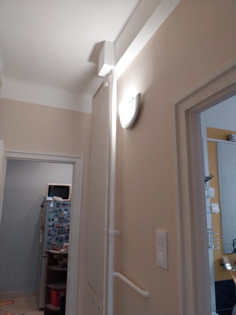 A hálószobában viszont lehetőség adódott arra, hogy álmennyezet fölött vezessem el a kábeleket, így itt gégecsőbe húzott vezetékeket alkalmaztam a fürdőszoba és a szoba saját áramköreinek kiszolgálására. Ez a megoldás nemcsak biztonságos, hanem szinte teljesen láthatatlan is maradt a lakók számára.